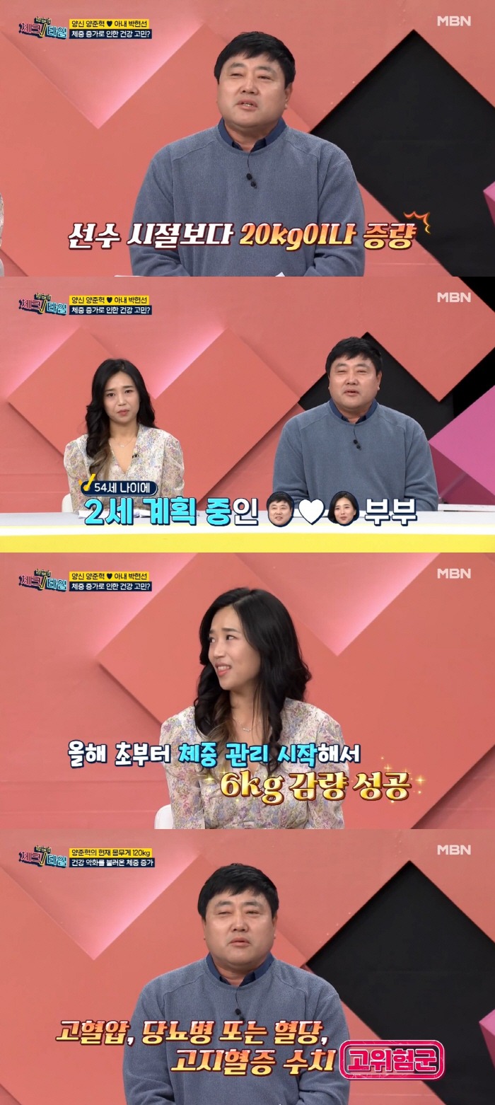 4월 8일 방송된 MBN '한번 더 체크타임'에는 양준혁-박현선 부부는 게스트로 출연해 양준혁이 결혼 후 20kg가 증가했다고 밝혔습니다.